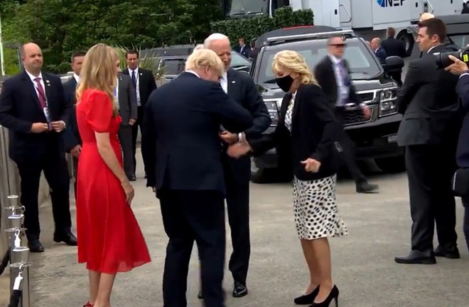 Trong khi đó, màn chào hỏi giữa Thủ tướng Johnson với Đệ nhất phu nhân Jill Biden cũng khá bối rối. Khi bà Jill Biden ch́a tay ra để chuẩn bị bắt tay th́ đáp lại Thủ tướng Johnson chỉ chạm cùi chỏ. Chạm cùi chỏ là cách chào hỏi phổ biến của các nhà ngoại giao trong bối cảnh đại dịch Covid-19. Đệ nhất phu nhân Mỹ đă nhanh chóng nhận ra và làm tương tự.