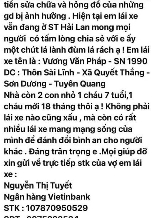 Thông qua báo chí, anh Pháp gửi lời cảm ơn chân thành tới tấm lòng của tất cả mọi người đã giúp đỡ anh lúc khó khăn hoạn nạn. Bên cạnh đó, nam tài xế cũng đưa ra cảnh báo có một tài khoản ngân hàng mạo danh anh để nhận tiền ủng hộ. Đồng thời, khẳng định mình chỉ sử dụng duy nhất 1 tài khoản của Ngân hàng Vietcombank mang tên Vương Văn Pháp.