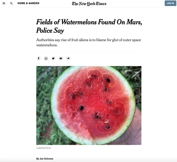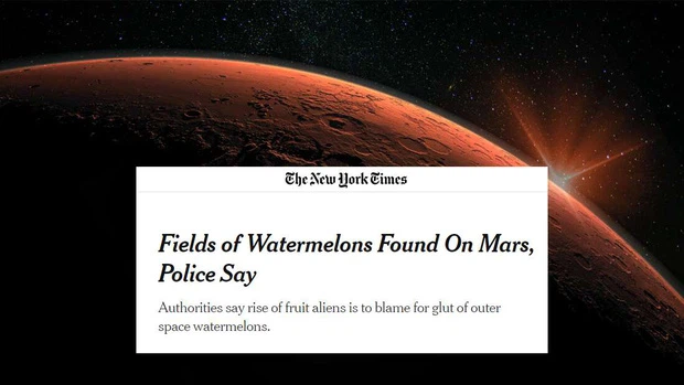 Bài viết có tựa đề "Cảnh sát cho biết đã tìm thấy cả một ruộng dưa hấu trên sao Hỏa". Tuy nhiên, bên trong bài lại có ít thông tin đến nực cười. Chỉ vỏn vẹn 2 câu dường như không liên quan lắm: "FBI từ chối bình luận về thông báo có mưa dưa hấu, nhưng xác nhận rằng kiwi đã bị chặn. Một câu chuyện chán ngắt."