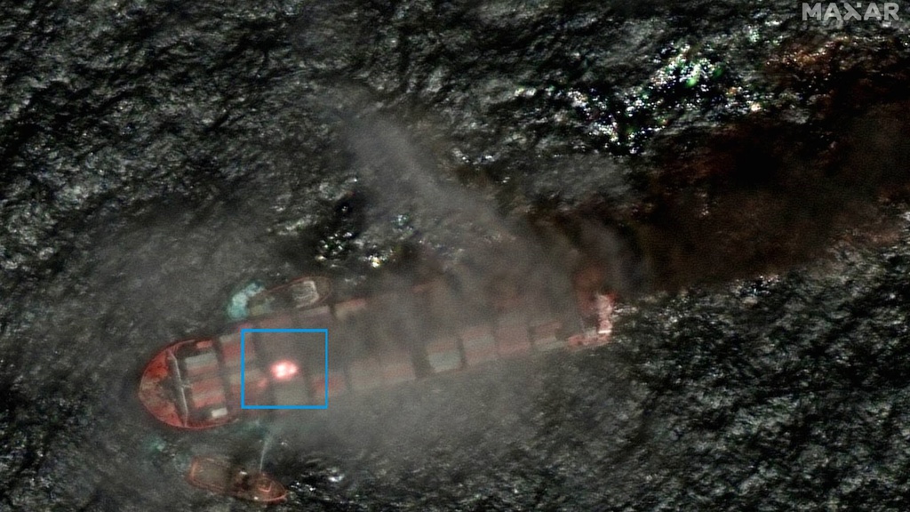 Đám cháy trên tàu X-Press Pearl hôm 22/5. Ảnh: Maxar.