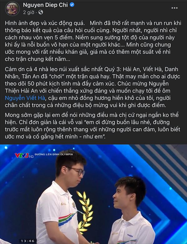 'Lần đầu tiên trong lịch sử xem Olympia mà khóc. Thật sự rất tiếc cho Viết Hà, chỉ là em bấm chuông chậm hơn Hải An mà thôi. Nhìn em khóc mà thương quá. Con đường phía trước còn rất dài, chúc em gặt hái được nhiều thành công hơn nữa.'