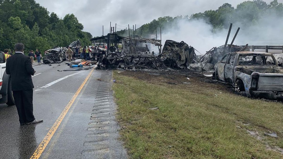 Chiếc xe tải chở các em về nhà tình thương quận Tallapoosa, do Hiệp hội Cảnh sát trưởng Alabama điều hành, thì bất ngờ gặp tai nạn. Giám đốc nhà tình thương Candice Gulley là người sống sót duy nhất sau khi chiếc xe xảy ra va chạm và bốc cháy. Trong ảnh, bão Claudette đã gây mưa lớn và ngập lụt khiến các phương tiện khó di chuyển. Ảnh: AP.