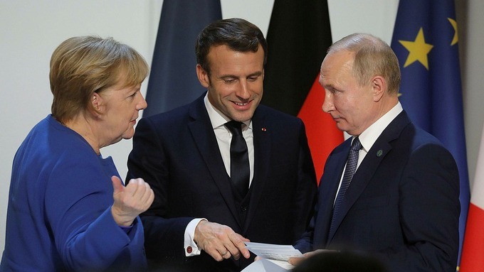 Thủ tướng Đức Angela Merkel (trái), Tổng thống Pháp Macron (giữa) và Tổng thống Putin tại hội nghị ở Paris năm 2019. Ảnh: AFP.