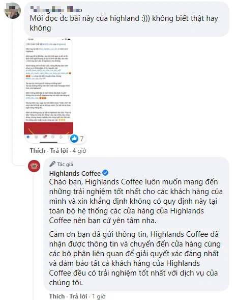 Trước làn sóng phản đối từ dư luận, không lâu sau, Fanpage chính thức của Highlands Coffee đã đưa ra phát ngôn chính thức:
