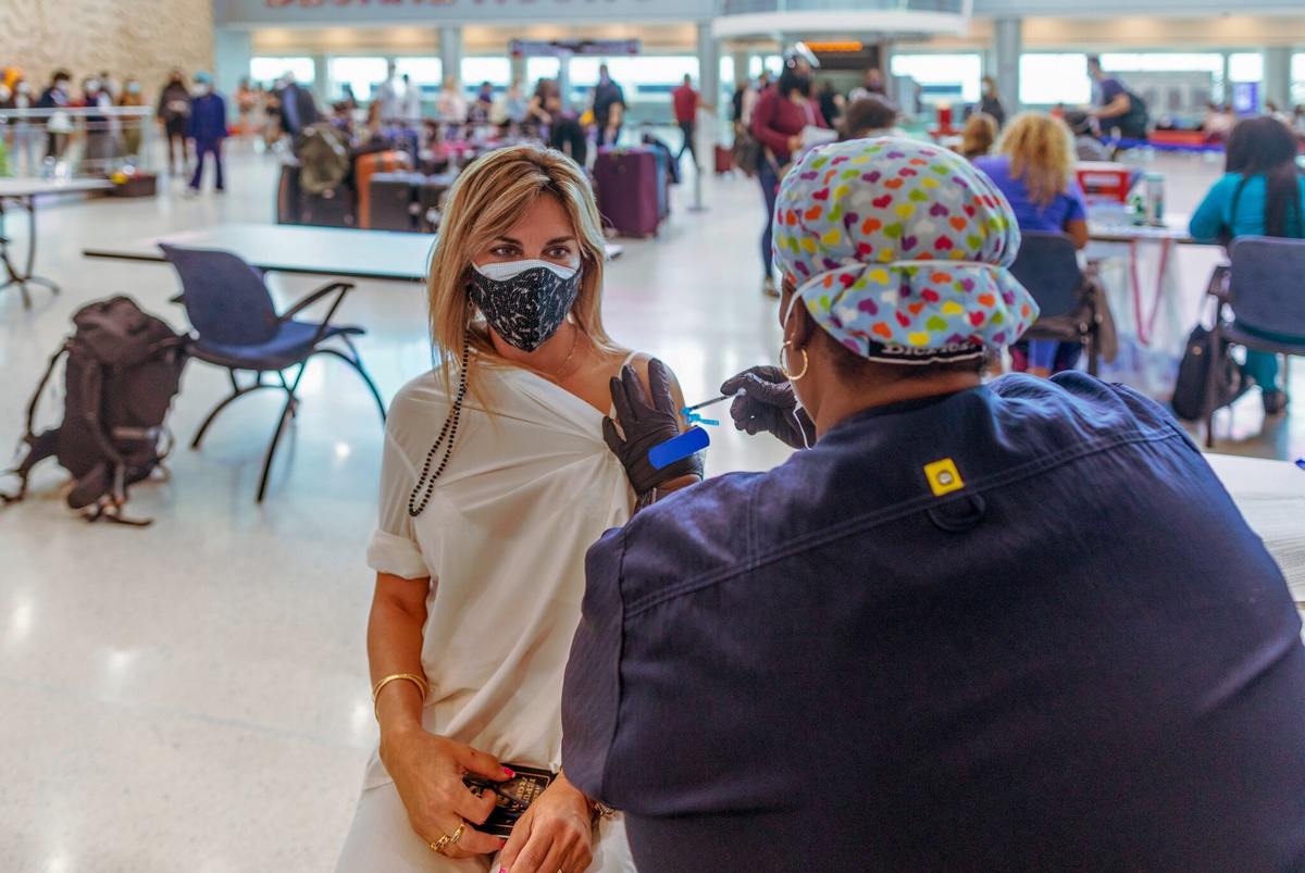 Một cô gái được tiêm phòng tại phòng chờ của sân bay quốc tế Miami. Ảnh: New York Times.
