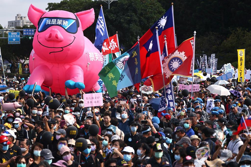 Người trên đảo Đài Loan biểu tình phản đối thịt lợn có chất tạo nạc của Mỹ vào ngày 22/11/2020. Ảnh: Reuters.