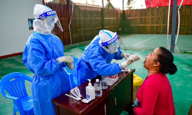 Nhân viên y tế lấy mẫu xét nghiệm Covid-19 tại thành phố Thụy Lệ, tỉnh Vân Nam Trung Quốc vào ngày 6/4. Ảnh: Tân Hoa Xã.