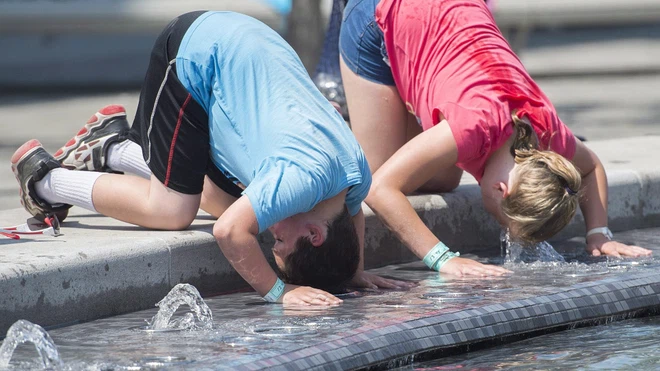 Người dân vục đầu xuống đài phun nước ở Canada để giải nhiệt trong cái nóng 40 độ C. Ảnh: CTV News