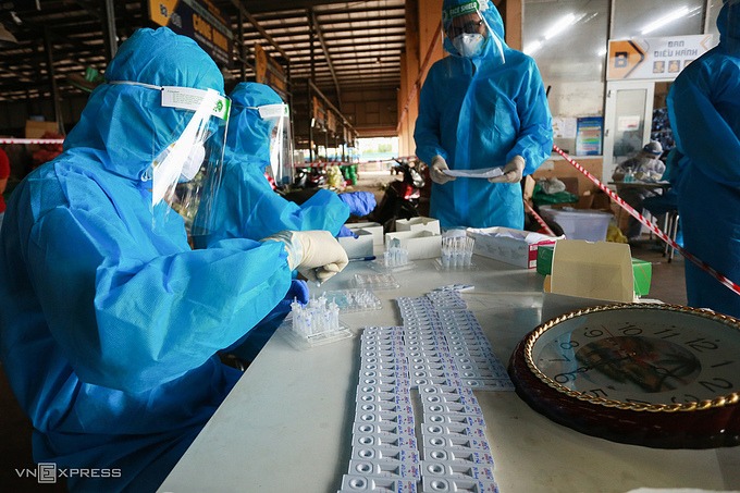 Nhân viên y tế đang xét nghiệm cho tiểu thương ở chợ Bình Điền, ngày 5/7. Ảnh: Quỳnh Trần.
