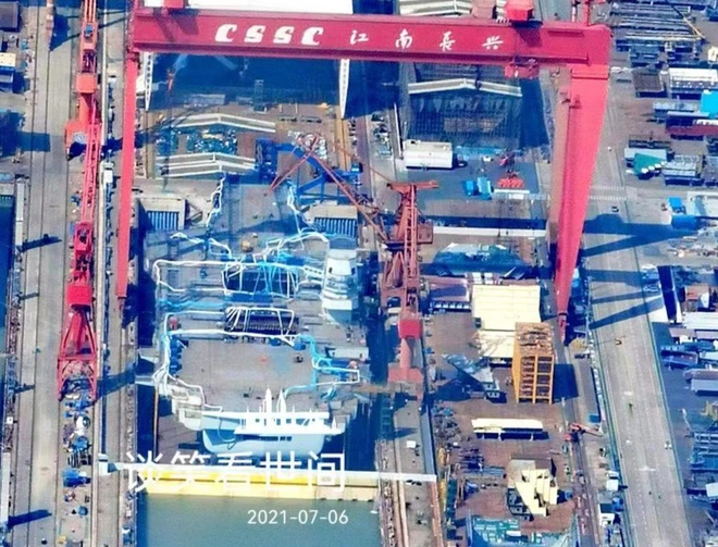 Trang tin Naval News ngày 6/7 đăng tải các hình ảnh mới cho thấy tàu sân bay Type 003 sắp hoàn tất của Trung Quốc tại xưởng đóng tàu Giang Nam, thành phố Thượng Hải.