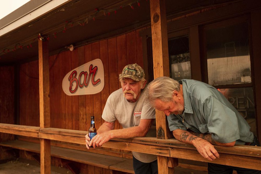 Dave Ferner (trái) và Bob Prary chứng kiến nhiều ngôi nhà bốc cháy ở trung tâm thị trấn Doyle, California, ngày 10/7. Prary, người quản lý một quán rượu ở thị trấn có khoảng 600 dân, cho biết ông đã thấy ít nhất sáu ngôi nhà bị phá hủy. Ngọn lửa tiếp tục âm ỉ vào ngày 11/7 trong và xung quanh Doyle.