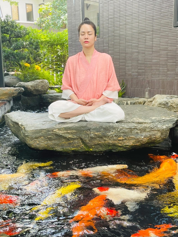 Thời gian này, Nhật Kim Anh hướng về thiền nhiều hơn để được tịnh tâm, thanh thản. Góc ngồi yêu thích của nữ siễn viên là bên hồ cá Koi thoáng đãng.