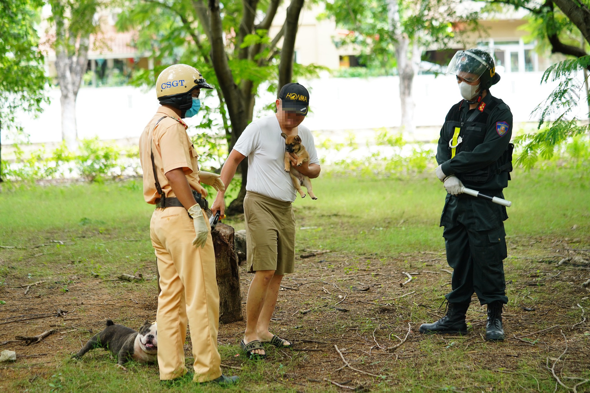 Trong bãi đất trống cách đó chừng 300m, CSGT cũng phát hiện người đàn ông không đeo khẩu trang dắt 2 con chó được cột dây, không rọ mõm ra đi dạo nên đã dừng xe, đi bộ vào trong khoảng đất.