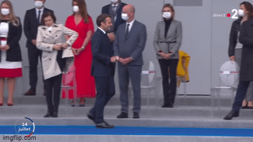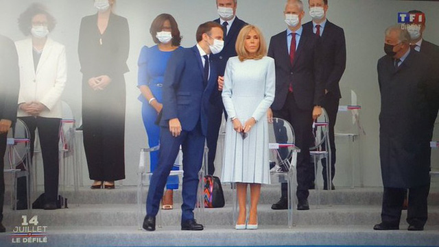 Tuy nhiên, tâm điểm chú ý trong sự kiện này lại chính là bà Brigitte Macron , Đệ nhất phu nhân Pháp. Bà Brigitte Macron đang trở thành chủ đề gây tranh cãi trên trên mạng xã hội khi bà không đeo khẩu trang, tỏ thái độ lạnh lùng không mấy mặn mà với người chồng kém tuổi.