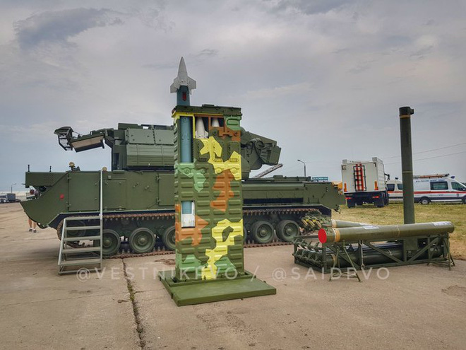 Tổ hợp Tor-E2 cùng các loại tên lửa trong khu vực trưng bày của Almaz-Antey.