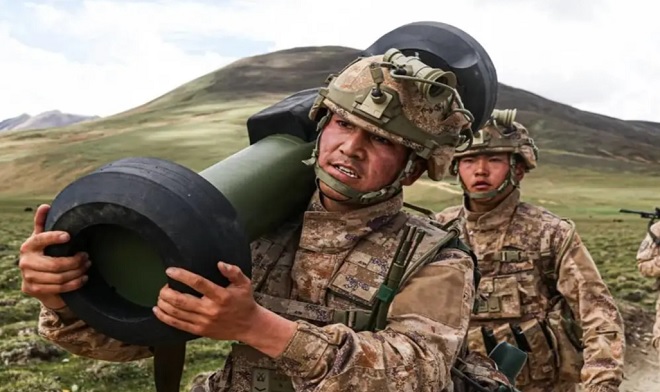 Một bức ảnh đăng kèm thông tin về cuộc tập trận, cho thấy binh sĩ Trung Quốc vác trên vai tên lửa chống tăng HJ-12.