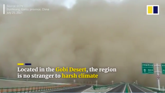 Theo báo Bưu Điện Hoa Nam Buổi sáng (SCMP), trận bão cát xảy ra khoảng 3h chiều ngày 25/7 tại thành phố Đôn Hoàng, tỉnh Cam Túc, đông bắc Trung Quốc. Cơ quan khí tượng địa phương cho hay, bão cát khiến bầu trời chuyển vàng, bao trùm thành phố, cả tuyến đường cao tốc chìm trong bụi cát, tầm nhìn giảm xuống còn chưa đầy 5 m. Cơ quan này buộc phải ban bố cảnh báo bão cát ở mức vàng.
