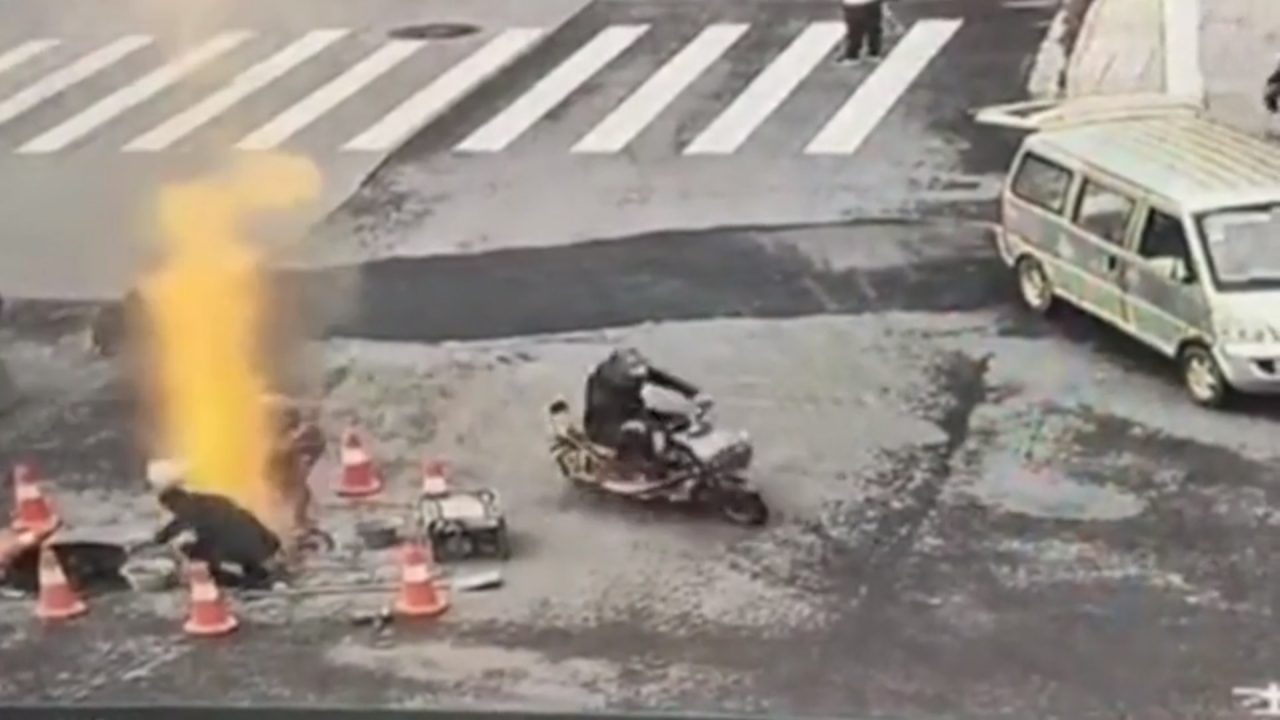 Ngọn lửa đầu tiên được nhìn thấy phụt từ dưới hố kiểm tra, nơi hai người thợ đang làm việc – Chụp màn hình video NBC New York