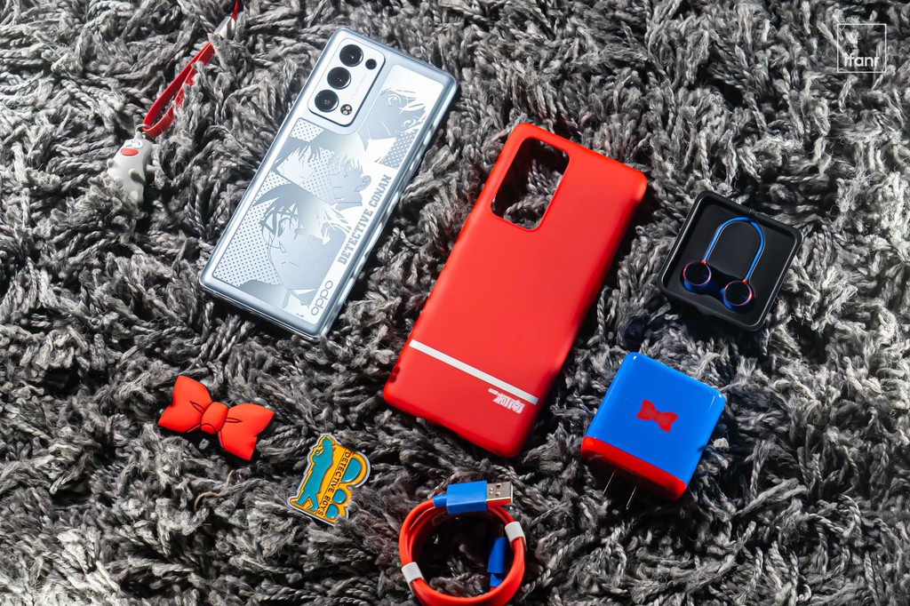 Ngoài ra, bộ sản phẩm đi kèm cũng rất đặc biệt, chúng ta có ốp lưng màu đỏ, huy hiệu nơ biến đổi giọng nói, huy hiệu đội thám tử nhí, OPPO Watch 2 có họa tiết đồng hồ bắn thuốc mê, OPPO Band tạo hình giống viên thuốc teo nhỏ APTX-4869 Conan từng uống phải, tai nghe Enco Free2 và một bộ sạc dự phòng sạc nhanh với biểu tượng của Siêu đạo chích Kid. Tất cả được đặt trong một chiếc hộp đựng mô phỏng lại phòng làm việc của Thám tử Mouri với cả 3 tầng.