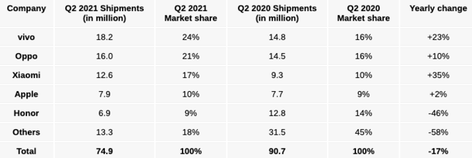 Theo số liệu thị trường smartphone Trung Quốc quý II/2021 do Canalys công bố, tổng số lô hàng smartphone bán ra tại nước này đạt tổng cộng 74,9 triệu máy, giảm 17% so với 90,7 triệu máy trong cùng kỳ năm ngoái. Số lượng công ty xuất xưởng trên 10 triệu máy ra thị trường cũng giảm từ 5 xuống còn 3.