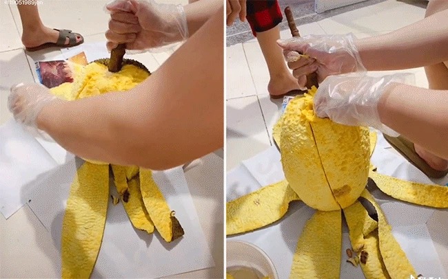 Cô nàng bóc vỏ mít như lột vỏ xoài. Từng phần vỏ của quả mít được bóc dễ dàng như lột vỏ xoài, rồi sau đó cả nhà cùng nhau thưởng thức ngon lành.
