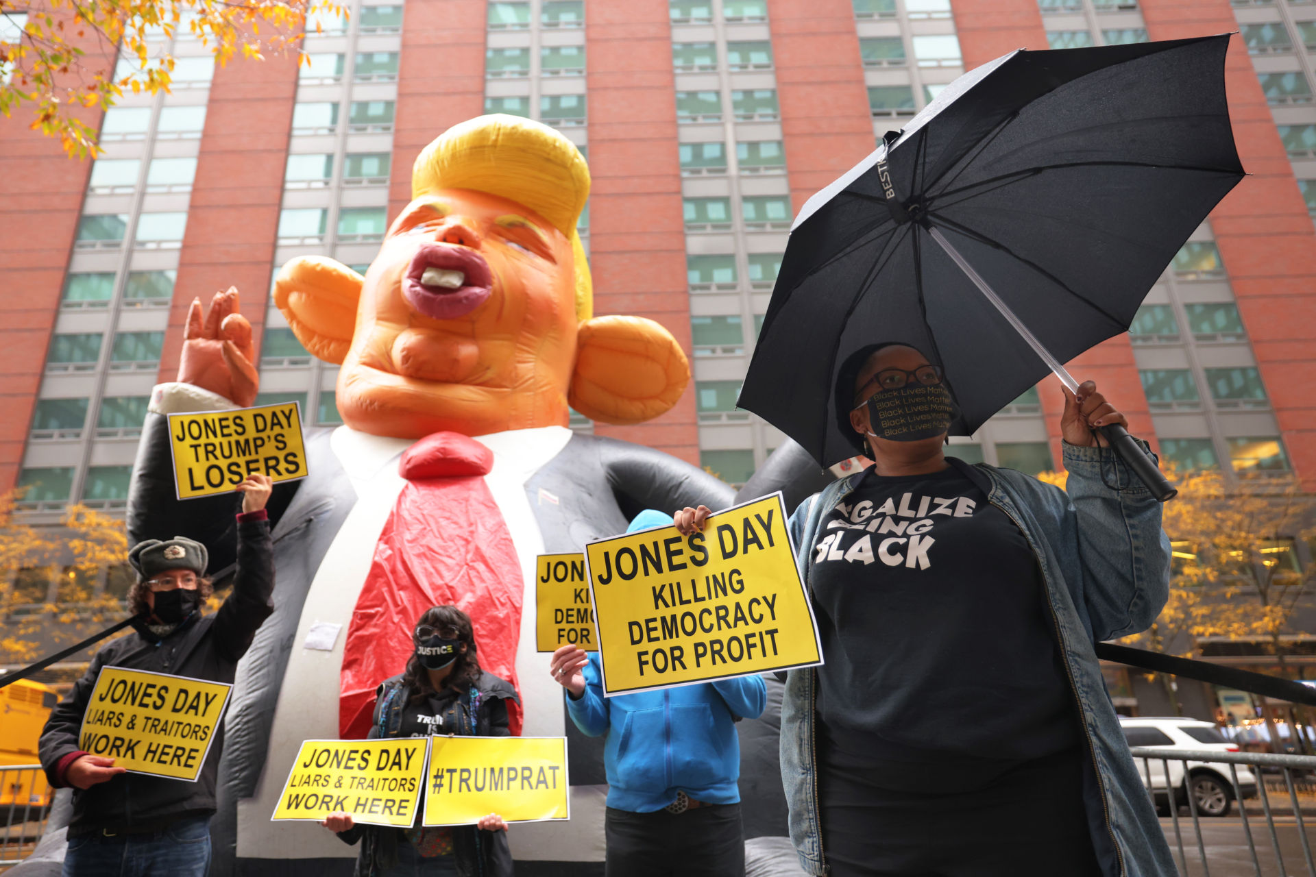 Người biểu tình với hình nộm của cựu Tổng Thống Trump tại văn phòng luật sư đại diện đảng Cộng Hòa tại New York. (Hình: Michael M. Santiago/Getty Images)