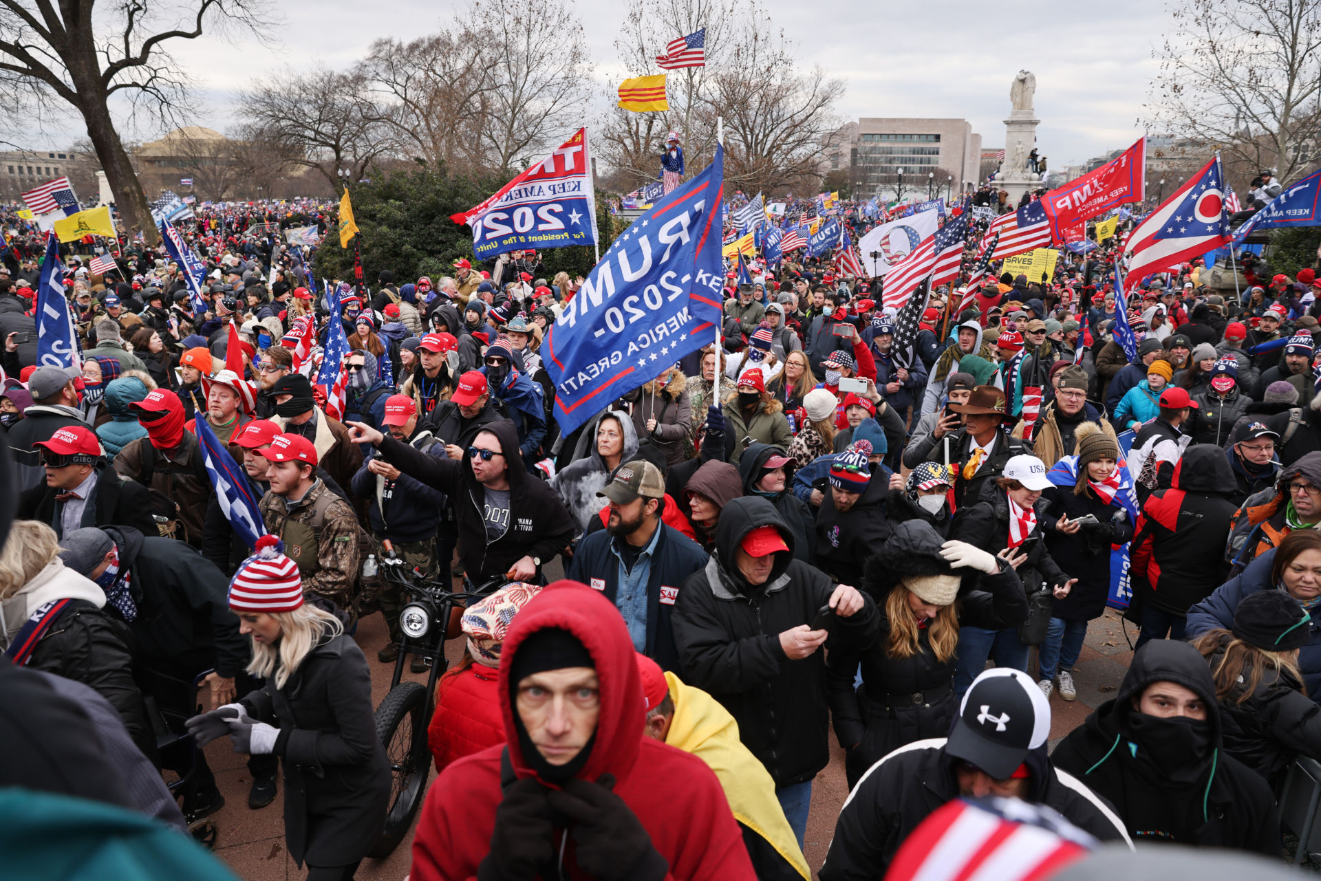 Người ủng hộ cựu Tổng Thống Trump kéo xuống trụ sở Quốc Hội gây bạo loạn ngày 6 Tháng Giêng. (Hình: Spencer Platt/Getty Images)