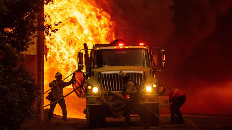 a group of people riding on the back of a truck: A firefighter saving an American flag as flames from the Dixie Fire consumed a home on Wednesday in Greenville, Calif.© Josh Edelson/Agence France-Presse — Getty Images A firefighter saving an American flag as flames from the Dixie Fire consumed a home on Wednesday in Greenville, Calif.