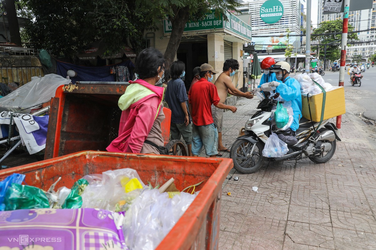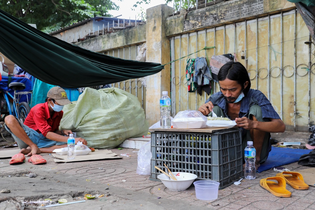Vừa phát cơm xong cho nhân viên bảo vệ, nhóm của ông Dũng lại sang bên kia đường lo bữa ăn trưa cho những người vô gia cư đang sống ở cạnh một điểm tập kết rác. Cả tháng nay, những phần ăn của nhóm giúp họ cầm cự được qua cơn đại dịch.