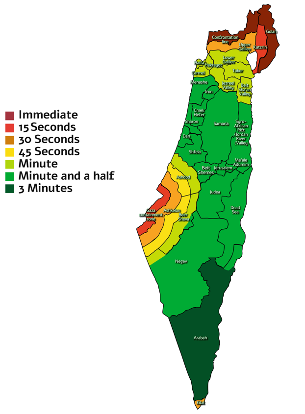 Một đồ họa ước tính thời gian từ khi rocket được khai hỏa từ hướng Gaza và nam Lebanon cho tới khi nó rơi xuống lãnh thổ Israel. Từ đồ họa này có thể thấy các hệ thống phòng không như Vòm Sắt chỉ có tối đa là 1 phút rưỡi để đánh chặn rocket.