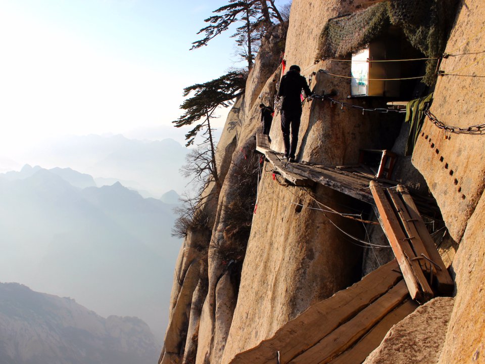 Một trong những địa điểm đáng sợ nhất trên thế giới là đường mòn bằng ván Mount Hua, nằm không xa thành phố Hóa Âm, tỉnh Thiển Tây. Để lên được đỉnh núi, bạn phải đi qua đường mòn này. Hãy suy nghĩ thật kĩ trước khi đến đây bởi đường mòn chỉ được tạo bởi những ván gỗ dày, đóng trên các chốt kim loại ở vách núi. Tất nhiên nó không hề có lan can hay bất kì chỗ bám víu nào cho bạn.