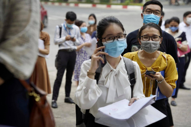 Người dân ở quận Cầu Giấy (Hà Nội) đến xin xác nhận giấy đi đường trong ngày 9-8 - Ảnh: Ngô Nhung