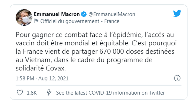 "Để giành chiến thắng trong cuộc chiến với dịch bệnh, việc tiếp cận vắc xin phải mang tính toàn cầu và bình đẳng. Đây là lý do Pháp chia sẻ 670.000 liều vắc xin dành cho Việt Nam, như một phần của chương trình COVAX", Tổng thống Emmanuel Macron thông báo trên mạng xã hội Twitter ngày 12/8.