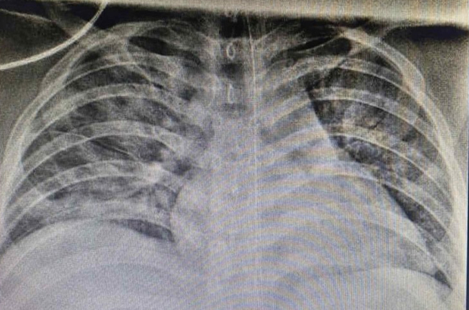 Ban đầu SpO2 của bệnh nhi nâng lên 92-93%, sau đó giảm còn 84-86%, tình trạng hô hấp diễn tiến xấu hơn. Trẻ được nâng cấp hỗ trợ oxy thành thở máy không xâm nhập, vẫn không cải thiện. Hình ảnh X-quang phổi cho thấy tổn thương phổi nặng lan tỏa hai bên, biểu hiện hội chứng suy hô hấp cấp tiến triển (ARDS), được đặt nội khí quản thở máy. Bé là bệnh nhi Covid-19 đầu tiên trong cả nước phải đặt nội khí quản thở máy.