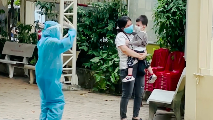 Tình nguyện viên dỗ em bé bằng điệu nhảy vui nhộn. Việt Trang, 29 tuổi, nhảy múa, làm nhiều trò để dỗ dành một em bé xa mẹ, như cách cô vẫn vui đùa để giúp các cô chú lớn tuổi giảm căng thẳng khi tiêm vaccine.