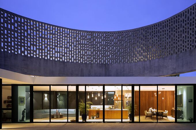 Các ô trống như tổ ong trên hình trụ cho phép ánh sáng tự nhiên đi qua để gia chủ cảm nhận sự thay đổi của thời gian. Bên cạnh đó, chiều sâu của hình trụ giúp không gian có đủ bóng râm suốt cả ngày mà không cần dùng thêm mái che.