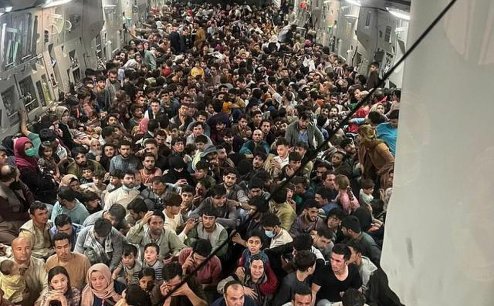 Các bức ảnh do báo Mỹ đăng tải cho thấy cảnh máy bay vận tải quân sự C-17 của Mỹ chật cứng người tị nạn Afghanistan, trong khi binh sĩ Mỹ bất lực ngăn chặn.