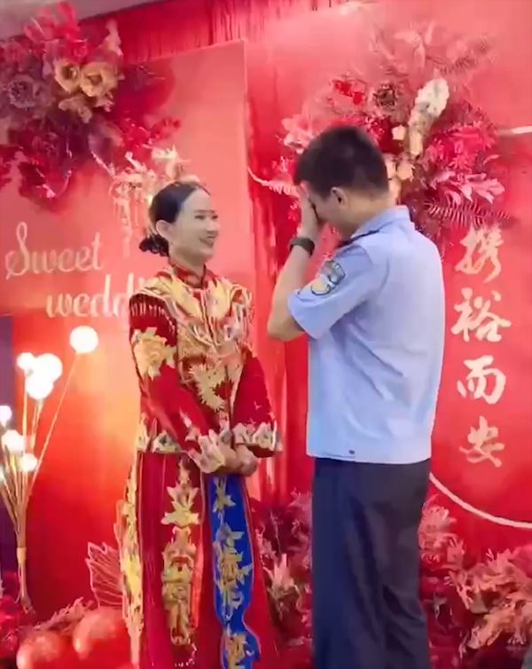 Theo tìm hiểu, chú rể là cảnh sát đang ở lại tuyến đầu phòng chống dịch Covid -19, cô dâu đến từ Quý Châu đã phải hoàn thành lễ cưới một mình ở quê nhà.