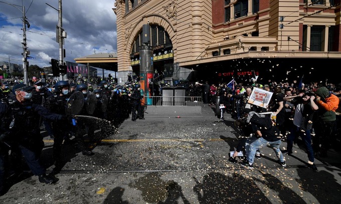 Cảnh sát đụng hộ hàng trăm người biểu tình phản đối lệnh phong tỏa tại Melbourne và Sydney, trong lúc Australia ghi nhận số ca nhiễm mới cao kỷ lục.