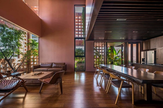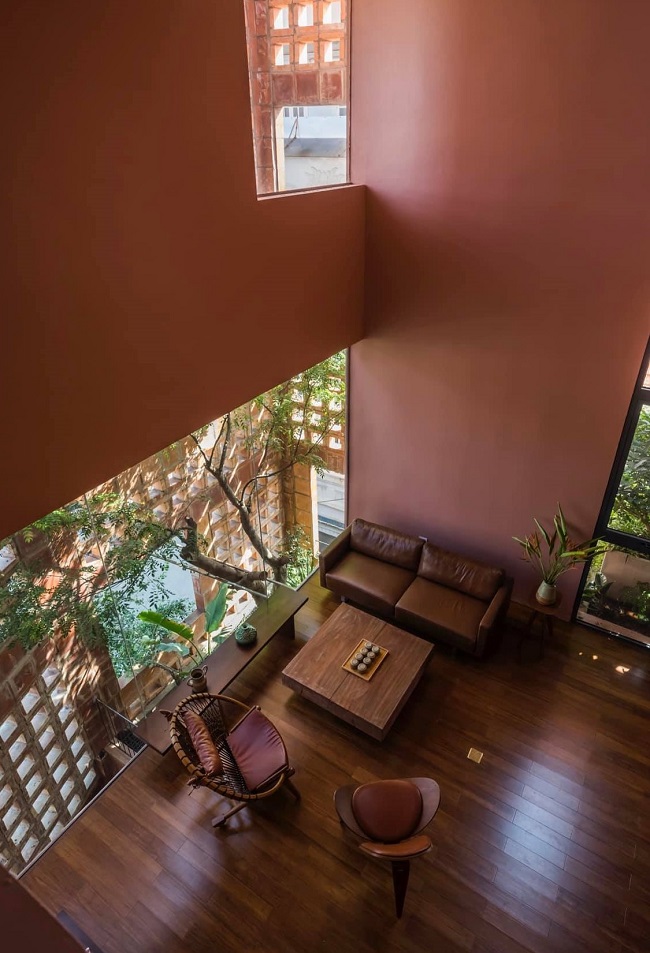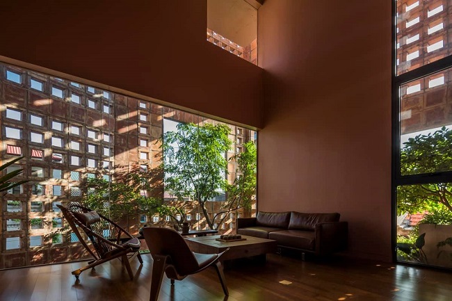 Bên cạnh đó việc kết hợp khung cửa kính và các lỗ thoáng trên bức tường gạch gốm có tác dụng lấy sáng hiệu quả mà không mang lại cảm giác quá nóng vào mùa hè. Thiết kế hệ thống thông gió 3 lớp gồm lớp gạch gốm bên ngoài, không gian cây xanh xen kẽ, và các ô cửa, giúp ngôi nhà thoáng mát vào mùa hè mà không cần hoặc hạn chế tối đa việc sử dụng điều hòa.