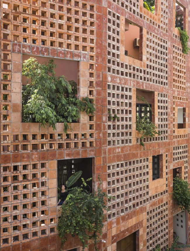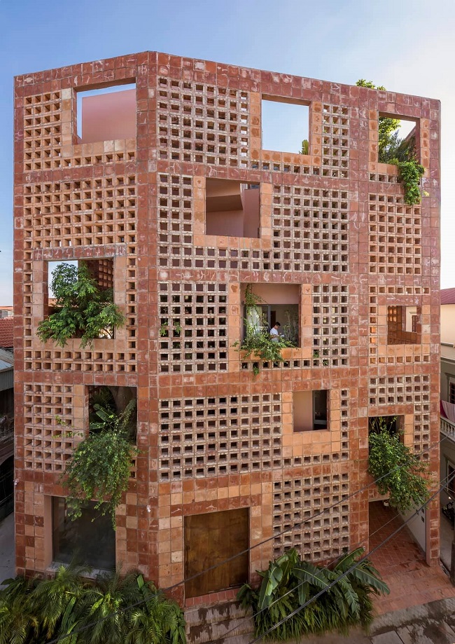 Bức tường gạch gốm còn chắn nắng trực tiếp vào nhà, nhưng vẫn cho gió và ánh sáng đi qua, kết quả là ngôi nhà sẽ thông thoáng.
