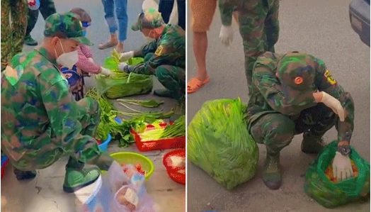 Hình ảnh các anh bộ đội đang tỉ mẩn nhặt và xếp từng ngọn rau. Chia từng quả cà chua... để mang cho bà con nhân dân. Khiến người xem vô cùng thích thú.
