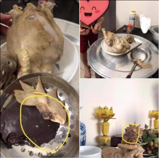 Chuyện gì đến cũng đến, chẳng biết tự tay cắt hay bị làm sao mà con gà luộc lên xong bị… rớt mất cái mào xuống đầu. Ai cũng biết rồi đó, mang gà trống đi luộc cúng thì phải giữ nguyên cái mào mới tốt. Ấy vậy mà…