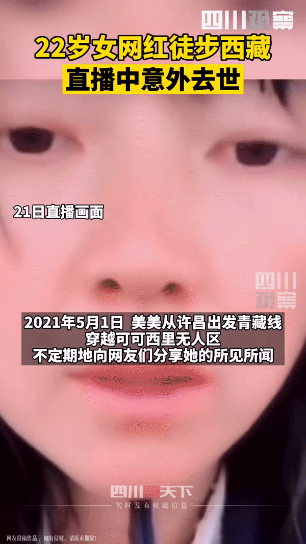 Theo như vào ngày 21/8, cô nàng được xác nhận đã tử vong gần sông Thông Thiên, Thanh Hải (Trung Quốc), khiến vụ việc thương tâm xảy đến với một blogger trẻ được yêu thích có tên Mỹ Mỹ, sau khi nữ blogger đã thiệt mạng khi đang livestream nói chuyện với fan của mình, tuy nhiên cái chết của cô hiện đang gây ra nhiều bàn tán xôn xao.