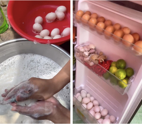 Có thể thấy cảnh cô vợ ngồi tỉ mẫn rửa từng quả trứng vịt bằng xà phòng cho sạch sẽ, sau đó mới cẩn trọng xếp đầy vào một ngăn tủ. Nhìn lên trên một chút, dân mạng còn thấy cô dự trữ cả trứng gà. Tổng số lượng trứng trong tủ có khi lên tới gần trăm quả.