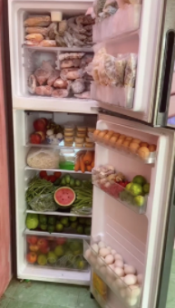 Ở ngăn đông trên cùng, cô vợ nhét kín hết các loại thịt, cá và khô. Tất cả đều được đóng gói hết sức cẩn thận để tránh làm bay mùi khắp tủ lạnh. Trong khi đó, ngăn bên dưới ngập tràn các loại rau củ, trái cây tươi xanh. Thậm chí, cô vợ còn không quên dự trữ… mấy chục hộp bánh flan để ăn qua mùa dịch.