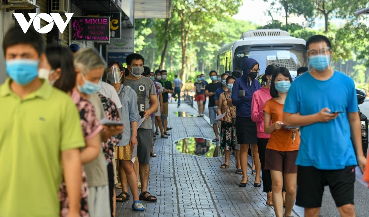 Residents wait for COVID-19 testing in Hoang Mai District, Hanoi.