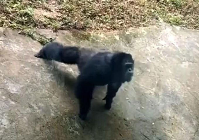 Trong đoạn video do một du khách ghi lại, con vật thông minh cũng áp hai tay xuống đất và duỗi hai chân phía sau rồi liên tục nhấc người lên xuống giống y hệt động tác chống đẩy. Những người đứng xem không khỏi ngạc nhiên trước khả năng của con tinh tinh. Họ hết quay nhìn người đàn ông chống đẩy rồi lại quay nhìn con vật bằng ánh mắt đầy thích thú và tán thưởng.