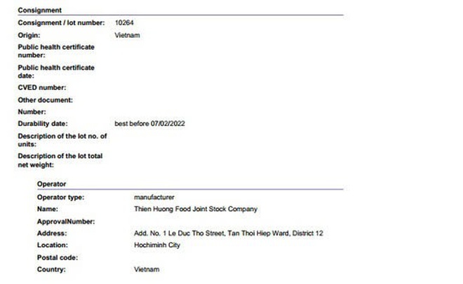 Bộ Công Thương tiếp tục chỉ đạo các đơn vị chức năng khẩn trương rà soát toàn bộ danh mục sản phẩm do Công ty Cổ phần Thực phẩm Thiên Hương đang phân phối trong nước, kiểm tra xác minh làm rõ quy trình sản xuất tuân thủ các điều kiện bảo đảm an toàn thực phẩm của Việt Nam và phù hợp với quy định về an toàn thực phẩm của nước nhập khẩu và xác định các vi phạm nếu có để bảo vệ quyền lợi người tiêu dùng.