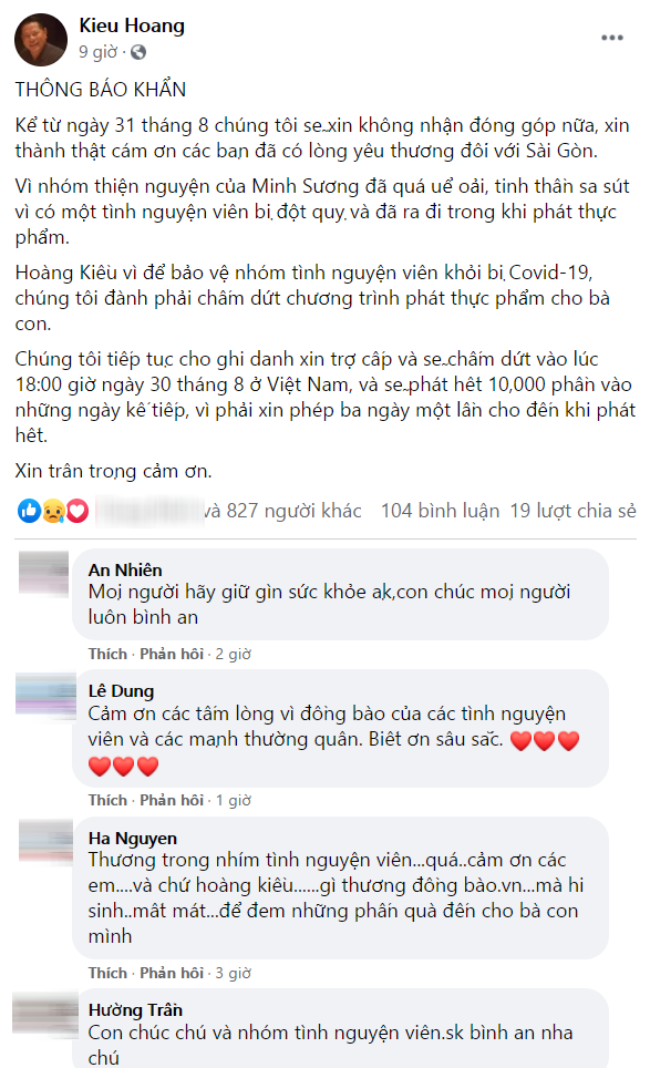"Hoàng Kiều v́ để bảo vệ nhóm t́nh nguyện viên khỏi bị Covid-19, chúng tôi đành phải chấm dứt chương tŕnh phát thực phẩm cho bà con.